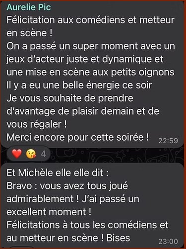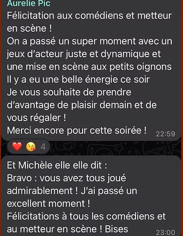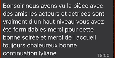 Sélectionnée au Festival de St Quentin Fallavier (38) en juin 2024, elle a obtenu les prix de la meilleure comédienne, du meilleur comédien, et des présidents du jury